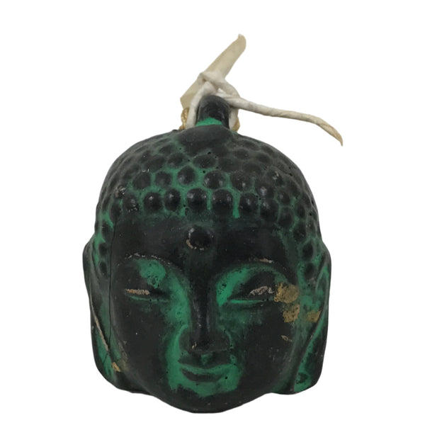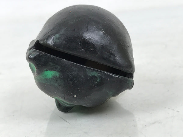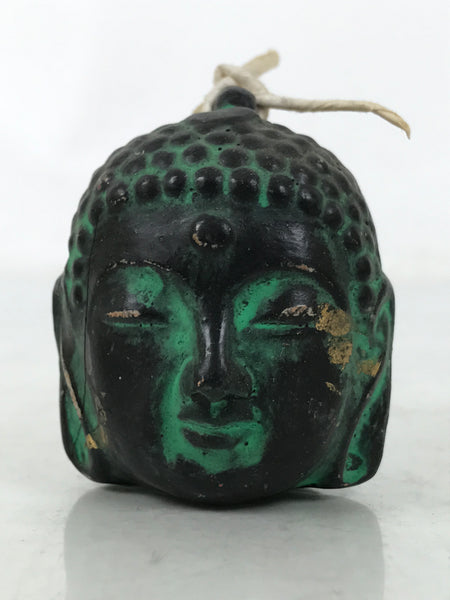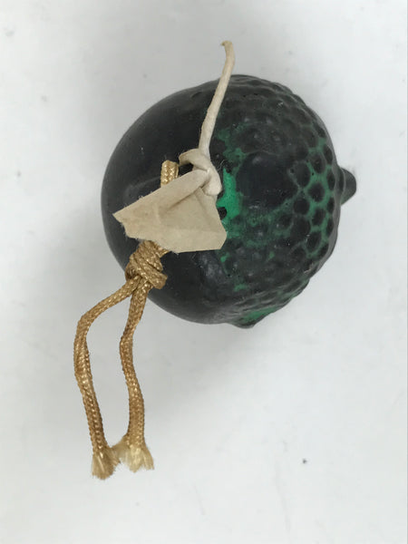 This is a vintage Japanese clay bell or dorei. Representing the Buddha's face, this dorei is black and green with some gold paint. It has a small ball inside and a braided gold string tied at the top. A paper was attached, but it is torn.