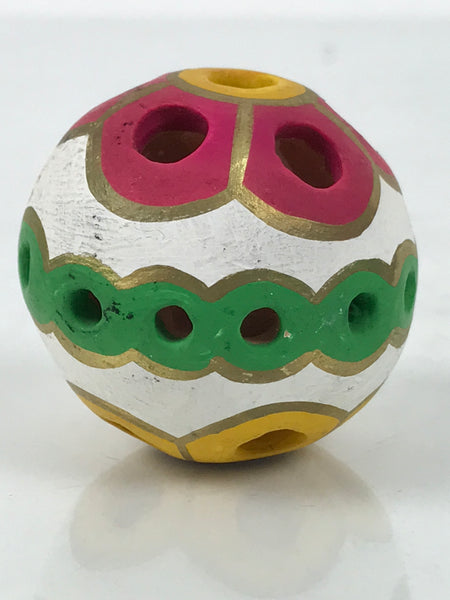 This is a vintage Japanese clay bell, Dorei or Tsuchi-Suzu, in the shape of a colorful temari ball. White, pink, green, and yellow with a floral design, this ball has a smaller classic-shaped dorei bell inside.