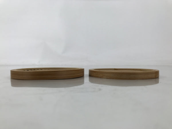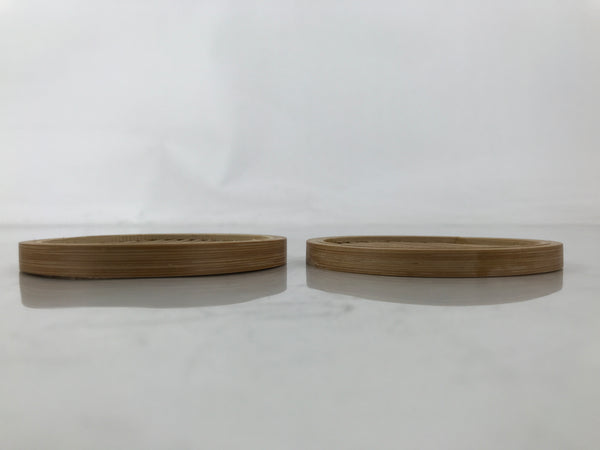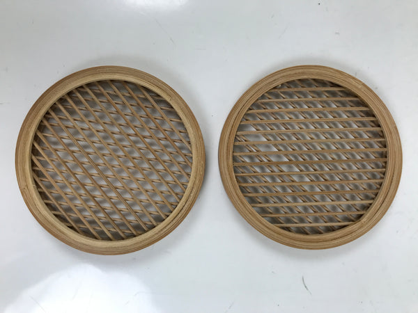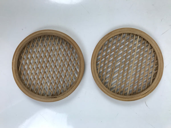 This is a pair of vintage Japanese bamboo drink saucers/coasters, or chataku. These are light brown and have a round frame with a mesh bottom. Bamboo coasters look cool and refreshing, making them good for the hot summer season.
