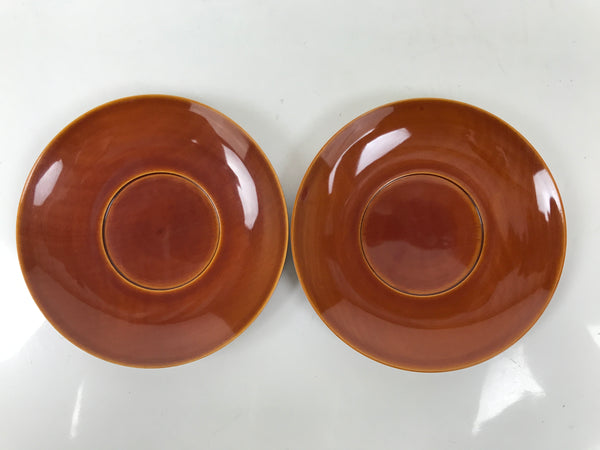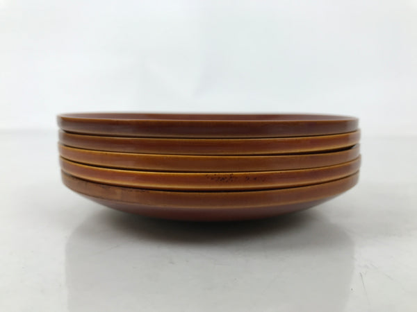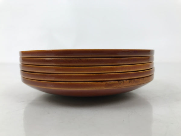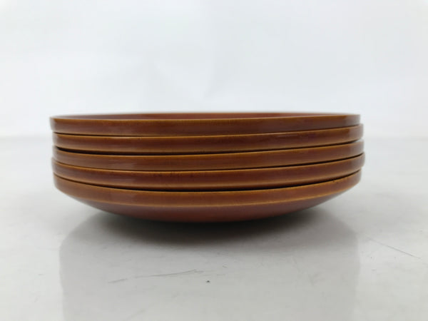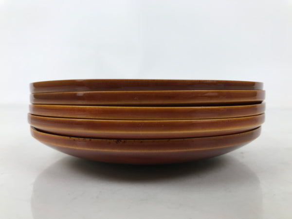 This is a five-piece set of vintage Japanese lacquered wooden drink saucers/coasters, or chataku. A stunning caramel brown lacquer color in true Hida Shunkei Nuri style, this lightweight and easily stackable set is a simple and classic. It has an indentation at the center to keep a cup from slipping off.