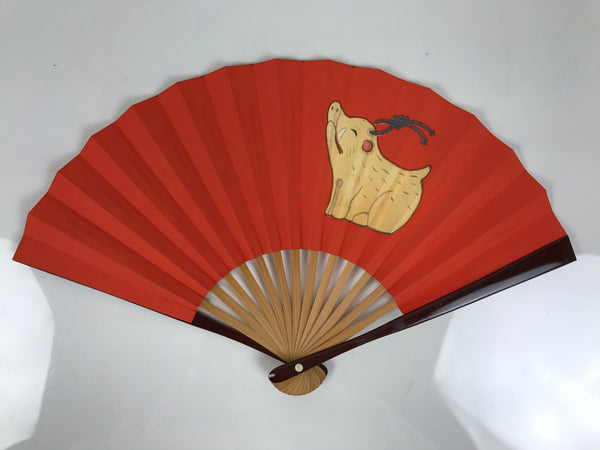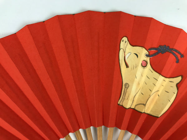This is a miniature traditional Japanese folding fan called sensu. You can use this when it's hot or as decoration. This fan is made with a natural bamboo frame (with lacquered ends) and sturdy washi paper. It features an adorable wild boar (inoshishi) clay bell (dorei) on a red background. The back side is plain white.