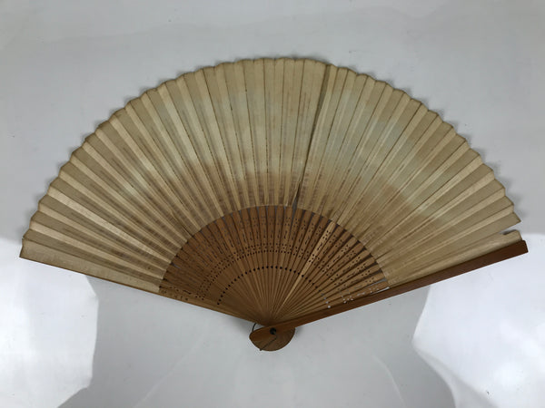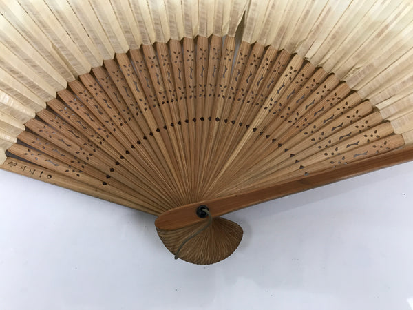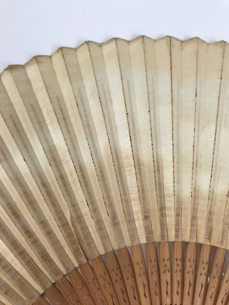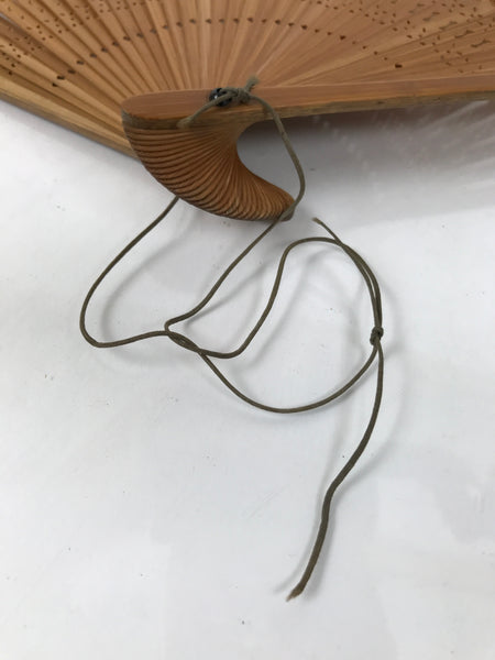 This is a traditional Japanese folding fan called sensu. You can use this when it's hot or as decoration. This fan is made with a natural bamboo frame. The front side has blue mountain tops with white clouds on a brown background. It has a brown string attached at the bottom.