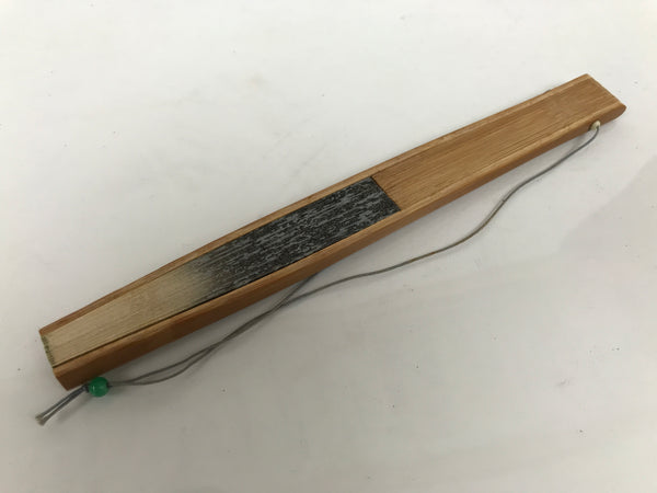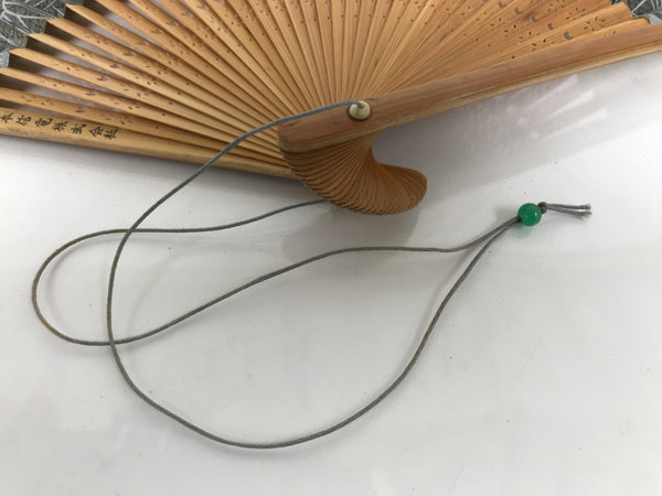 This is a traditional Japanese folding fan called sensu. You can use this when it's hot or as decoration. This fan is made with a natural bamboo frame with simple cutouts for extra decoration. The front side features stalks of bamboo with leaves in bands of beige and blue. The back side is plain beige. There is a gray string attached to the bottom with a green glass bead.