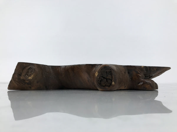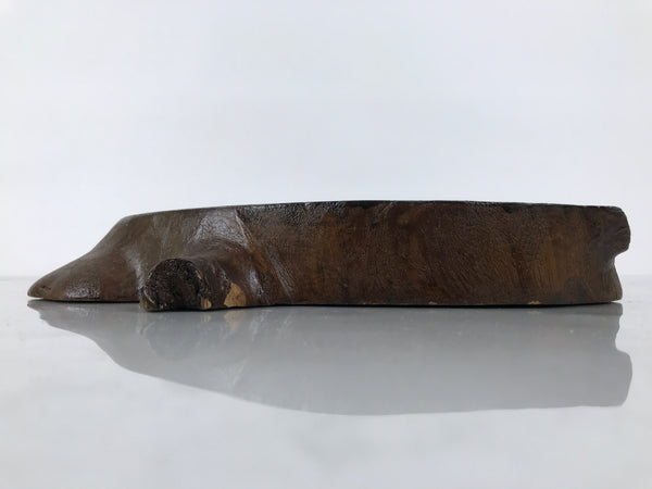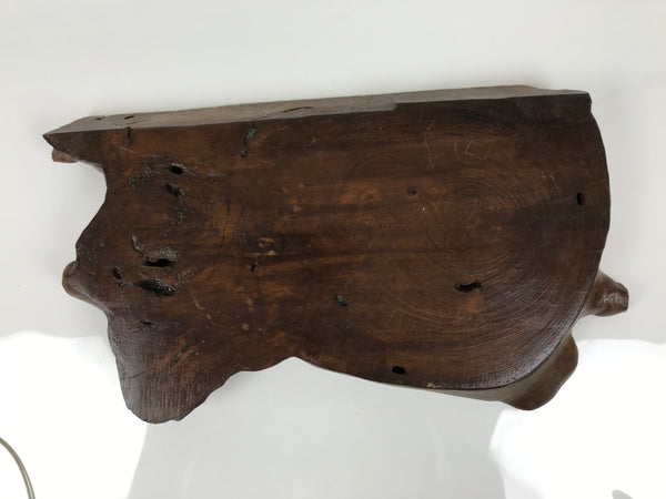 Used for the display of flower vases, ikebana arrangements, bonsai, and more, this classic, heavyweight, uniquely shaped kadai is one-of-a-kind, handcrafted from a piece of solid wood (cross-section of a tree trunk). It is stained dark brown finished with a clear lacquer coating. The stand has many different grooves and textures on all sides to create visual interest from any angle. It also has a straight edge back side that can fit easily against a wall.