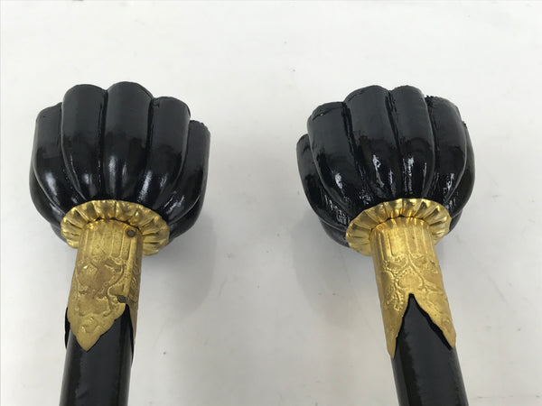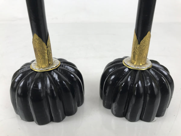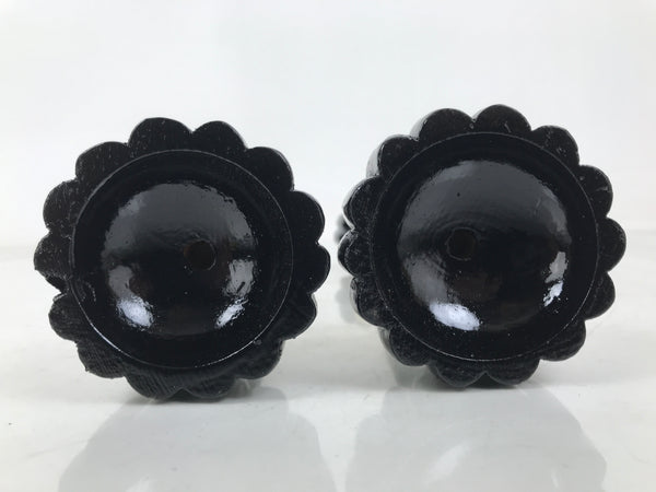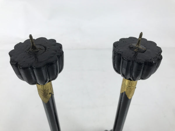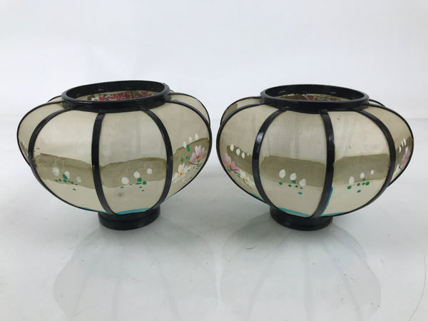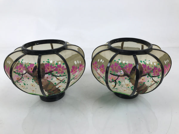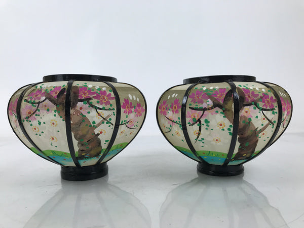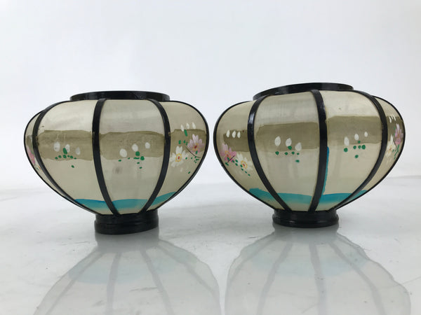 This is a vintage Hina doll furniture lantern set. A bonbori is a portable lamp traditionally used to light spaces during times without electricity (a lantern more decorative than a common brazier). This large pair of lanterns sit at the very top of a hina display at the ends. The frame and post are made of wood lacquered black with metal accents. The lantern top is made of translucent white silk and has pink cherry blossom trees hand-painted on it. The two pieces connect via a screw at the top of the post. It comes with the original paper box.