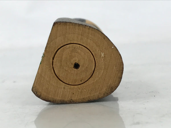 This is a vintage Japanese wooden doll figurine. It represents a boy in a black Kimono and has an old hairstyle. The head is wobbly. The body of the figurine is in a wooden cylinder that features a cut with a painting on one side. The painting depicts a pagoda at a temple, likely one of the temples in Kyoto, and trees.