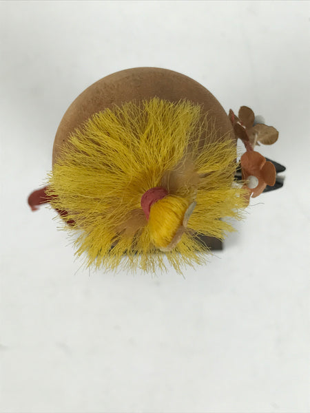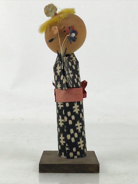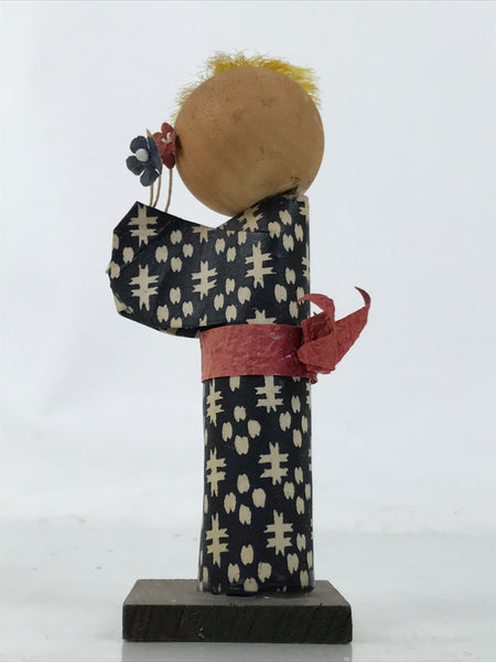 This vintage Japanese wooden kokeshi doll represents a girl or a women dressed in a black kimono with white abstract patterns. The obi is plain red. The girl holds a bunch of flowers in her hands in front of her face. She has yellow hair gathered in a bun. While the head of the doll is wood, both the kimono and the obi are washi paper. The doll is attached to a square wooden base.