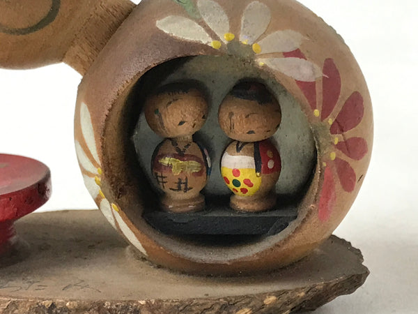 This vintage Japanese wooden kokeshi doll figurine represents a hyotan, a Japanese gourd, and a red sakazuki flat sake cup decorated with the character for longevity. Inside the gourd are hidden two tiny kokeshi dolls, visible only from one side. The outside of the gourd is decorated with red, white and green floral designs. There is an inscription on the base.