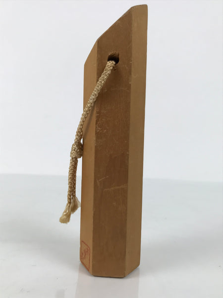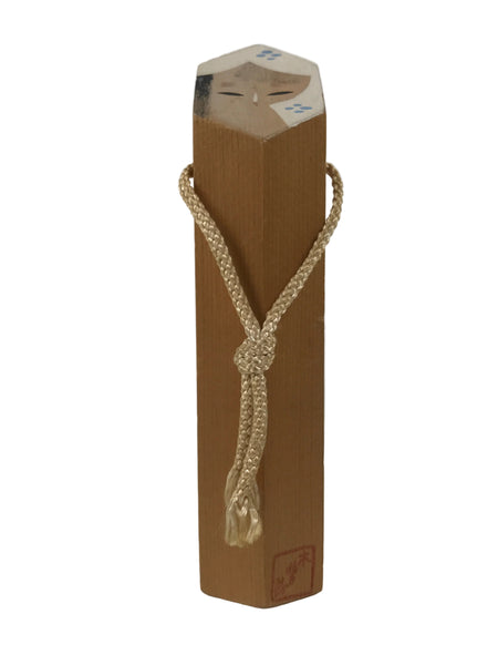 This is a vintage Japanese wooden figurine. A diagonally cut hexagon rod makes this figurine. The face is on the cut surface with a calm expression and a white veil. It has a hole and a string for hanging. There is an inscription around the bottom.