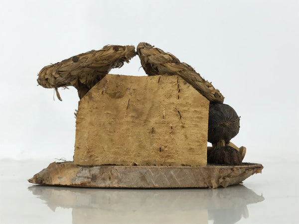 This vintage Japanese wooden kokeshi figurine features two dolls seating under straw mushrooms. The dolls have hand-painted faces with cute details. There is a panel on the right.