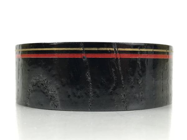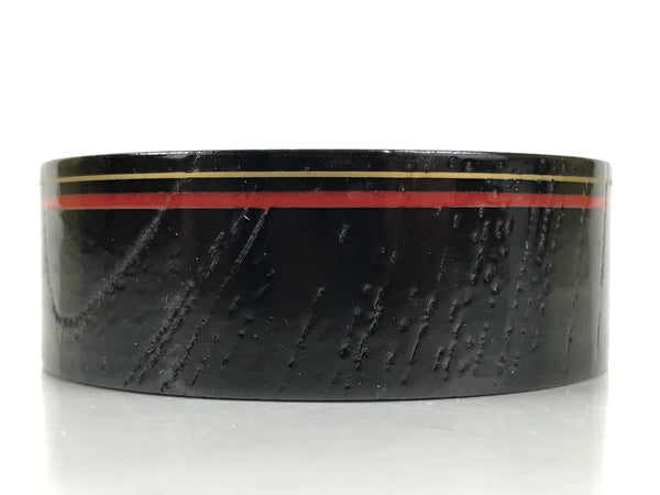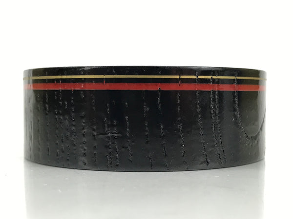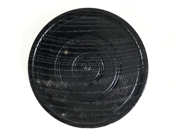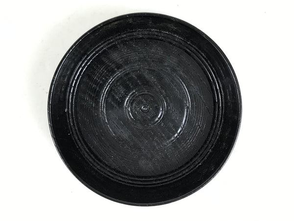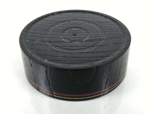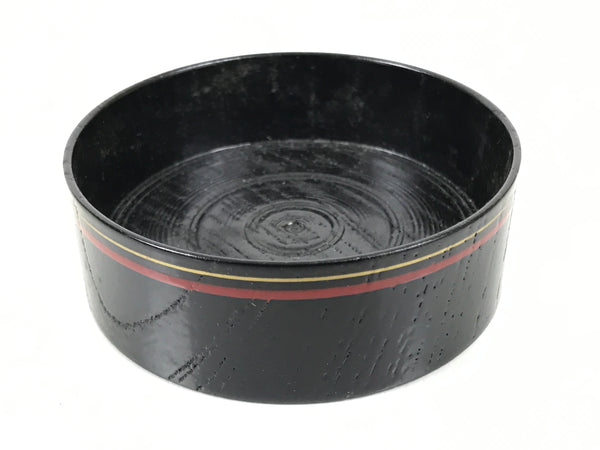 This is a Japanese vintage lacquered wooden cup or small bowl used to serve small snacks, such as nuts and small senbei, while serving and drinking sake. It is a stark black with a red and gold ring around the outside edge. It can also be used for storing jewelry and other small trinkets.