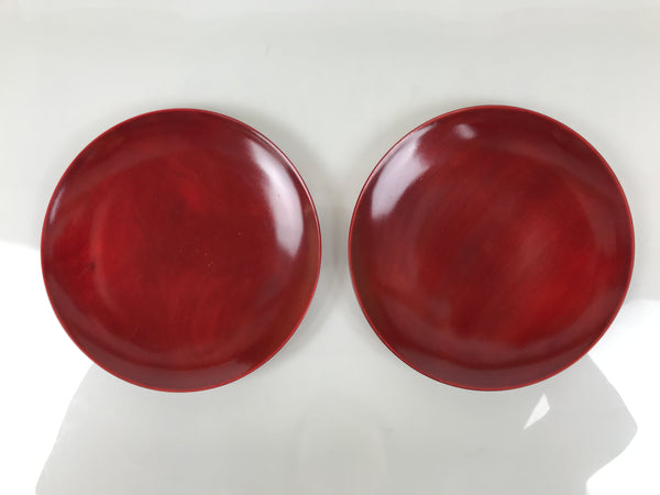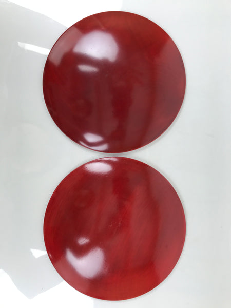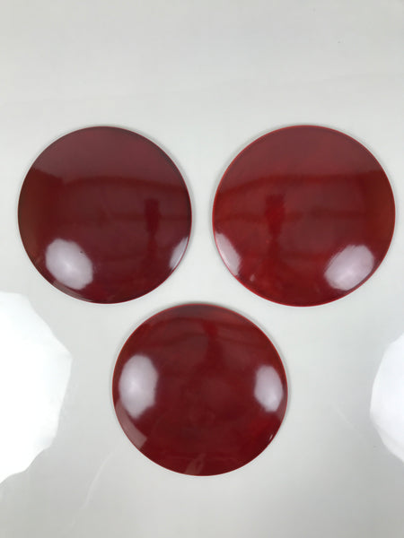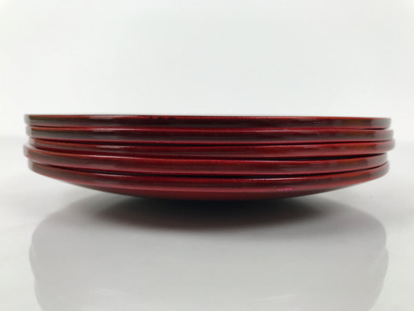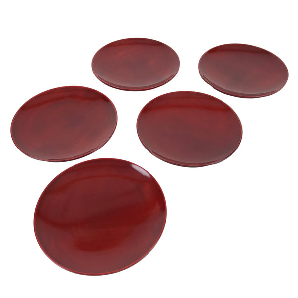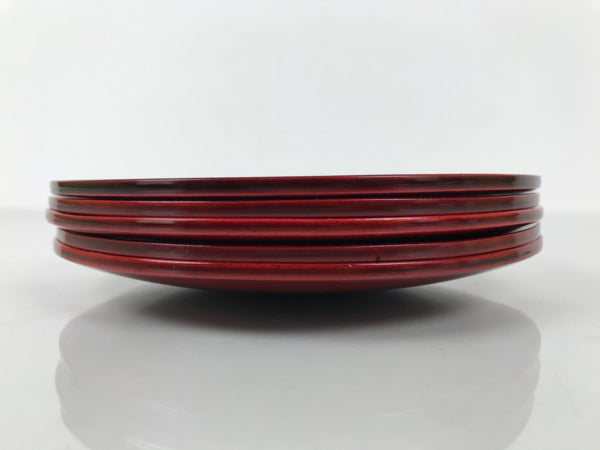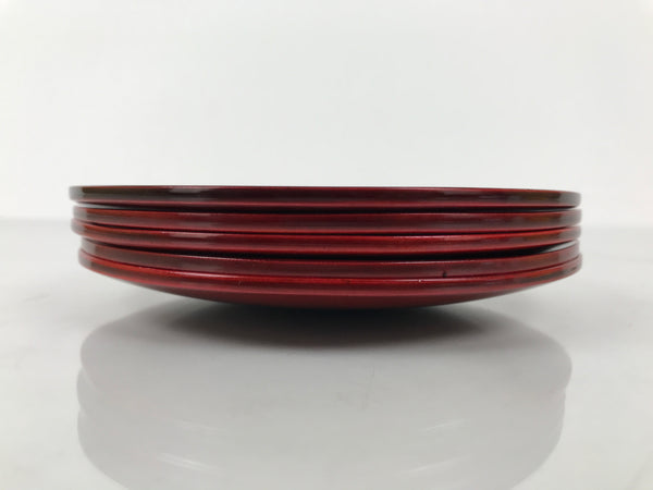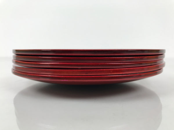 This is a vintage Japanese set of five lacquered wooden small plates. They are round and a reddish-brown color (almost red) with no designs, but they do feature the subtle natural wood grain through the lacquer. Also called meimeizara, these Hida Shunkei-nuri plates are used during tea ceremony when serving wagashi. They come in a paper box.