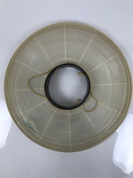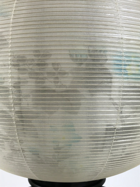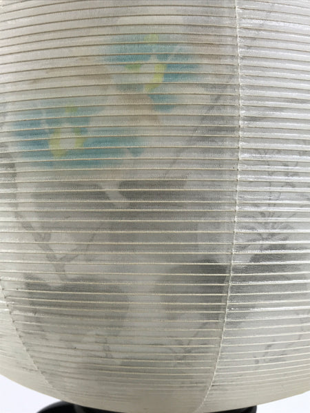 This is a vintage Japanese silk lantern. It has a double layer, with the inner layer decorated with a subtle design featuring black and blue Autumn flowers. The blue flowers might be fuyo flowers (a type of hibiscus). The lantern fits on a 3-legged black wooden stand. This type of lantern is usually used as a display during the Obon summer festival. This lantern flattens and is easily stored in the matching box.