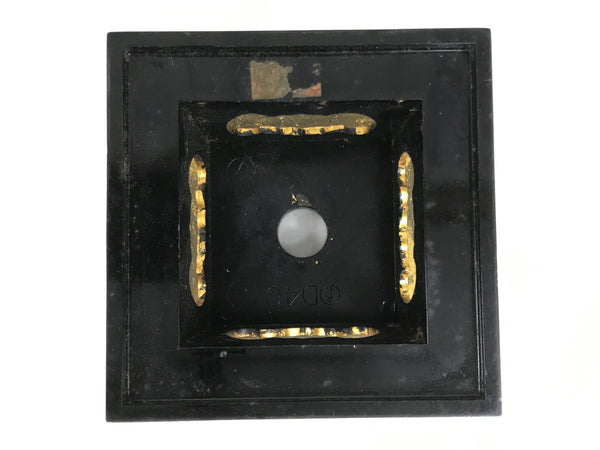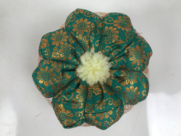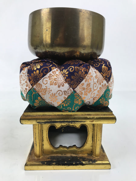 This is a vintage Japanese orin bell for Buddhist altars. It contains a brass metal bowl with a dark brown wooden striker that has silk fabric covering the striking end. It rests on an angular, rounded purple, white, teal, and gold silk pillow with light yellow yarn tassels. It also comes with a square black and gold resin stand.