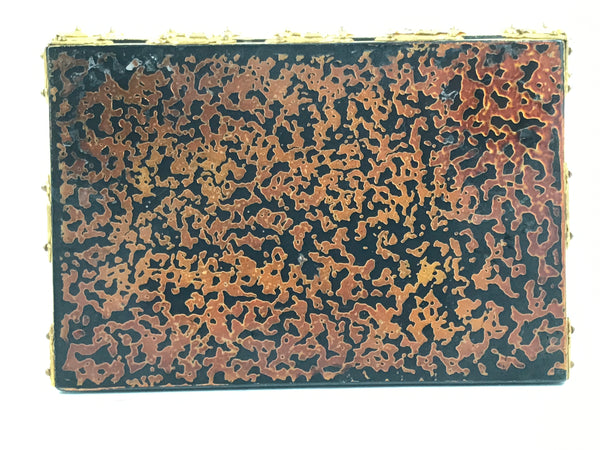 This is a vintage Japanese Buddhist altar offering table (uwajoku). It is coated with gold, orange, and black lacquer. It contains one removable tabletop piece. The edges are decorated with simple plant patterned metal embellishments. The top piece has a unique lacquer technique called wakasa nuri, a varied decorative style originating in Fukui Prefecture.