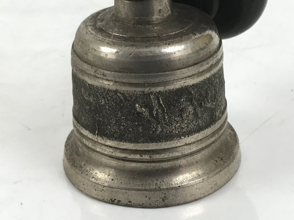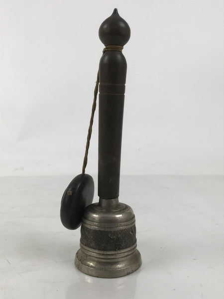 This is a vintage Japanese Buddhist handbell, or kongorei, used primarily during Buddhist ritual ceremonies and prayer. This bell is made mostly of silver-colored metal with a wooden handle. It comes with a wooden incense container attached by a string.