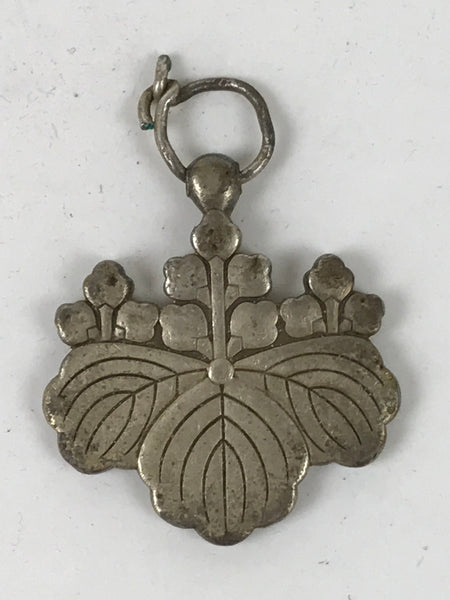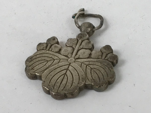 This vintage Japanese metal medal features three paulownia leaves with flowers on top. Medals of this type were given to soldiers after service at war. The back has inscriptions.