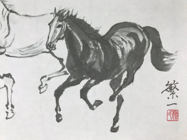 This Japanese shikishi art board is a printed reproduction featuring running horses in a realistic style painted in gray scale. At the top, there is a calligraphy of the kanji 馬, meaning horse, mirrored. It is a symbol of good fortune. This shikishi is signed with a name and a red seal, and it is stored in a plastic sleeve. There is a paper with explanations in Japanese on the back.