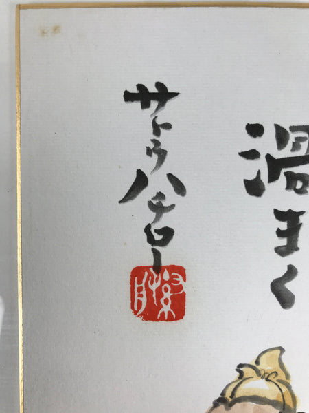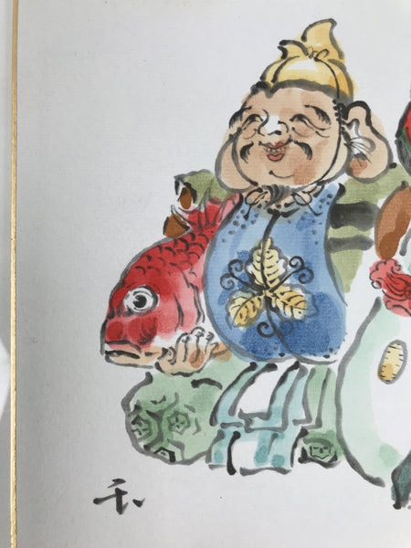 This Japanese shikishi art board is a printed reproduction of an artwork by Sato Hachiro featuring Ebisu, the god of prosperity, and Daikokuten, the god of commerce. Ebisu and Daikokuten are two of the Seven Lucky Gods. At the top of the shikishi, there is a calligraphy about happiness and good fortune. This shikishi is signed with a name and a red seal, and it is stored in a plastic sleeve.