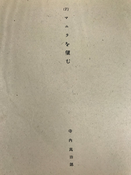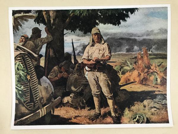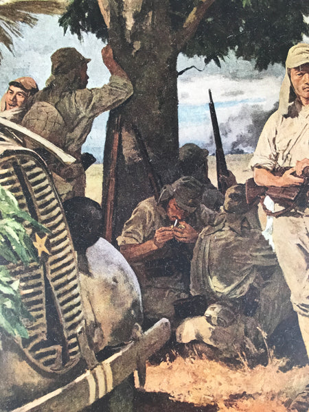 This is a vintage Japanese machine-printed reproduction of military art by Terauchi Manjiro. The piece is called 'Waiting for Manila', and it was painted in 1943. The piece is placed on a piece of cardboard with a protective sheet of paper on top, with the title and the name of the painter.