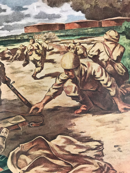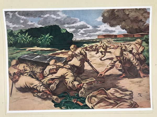 This is a vintage Japanese machine-printed reproduction of military art by Takashi Nakayama. The piece is called 'Soldiers fighting bravely'. It represents parachutists in Sumatra in 1942, taking an oil refinery in Palembang. The piece is placed on a piece of cardboard with a protective sheet of paper on top, with explanations in Japanese.