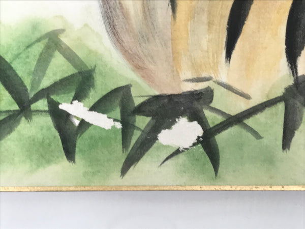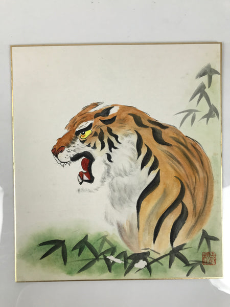This item is a hand-painted Japanese shikishi art board. It features a tiger roaring. Some greens and bamboo leaves are also painted. This shikishi is painted in color and it is signed with a red seal.