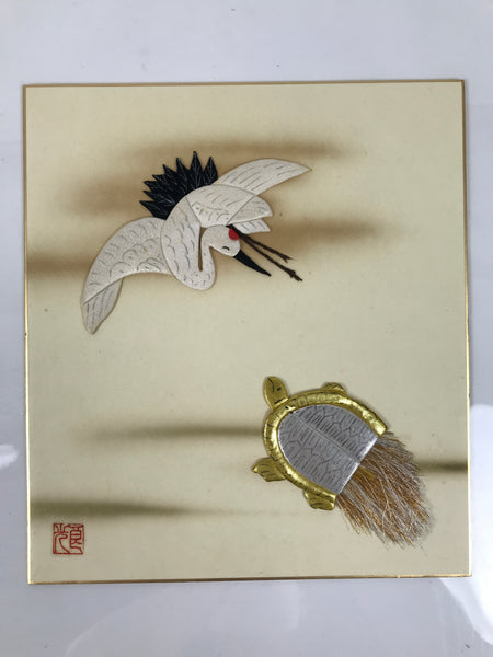 This vintage Japanese shikishi art board features an oshie-zaiku (Japanese patchwork) design of a swooping red crowned crane (tanchou). This bird, also refered to casually as tsuru is a symbol of longevity and good fortune. At the bottom is a turtle with a long tail. These turtles are prominent in Japanese traditional artwork and mythology and are called minogame. They are commonly associated with longevity. Oshie-zaiku gives a unique 3D appearance, and different textures and patterns of silk fabric, and the addition of hair and other materials adds extra dimension.