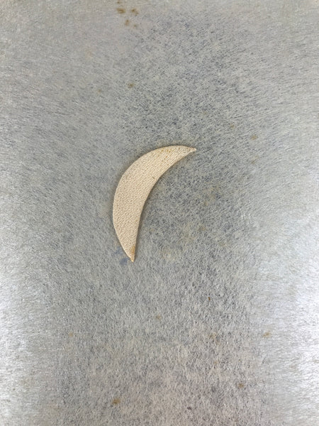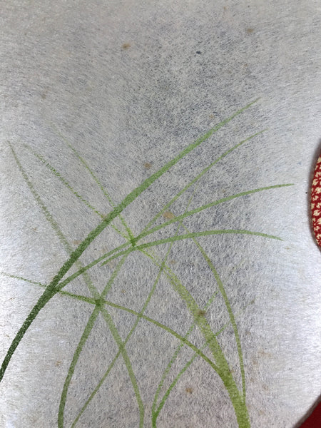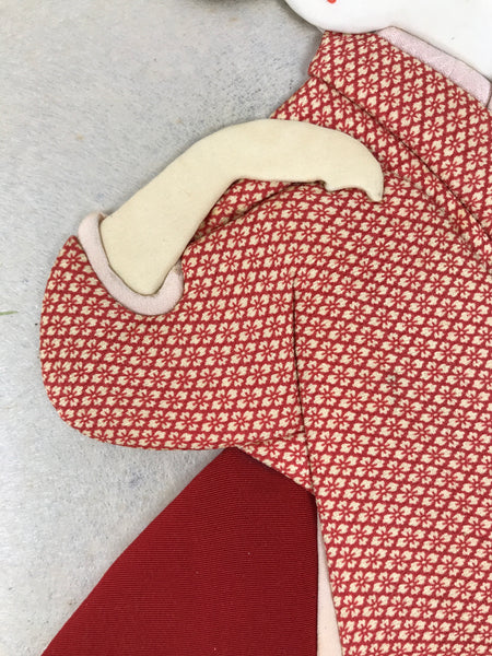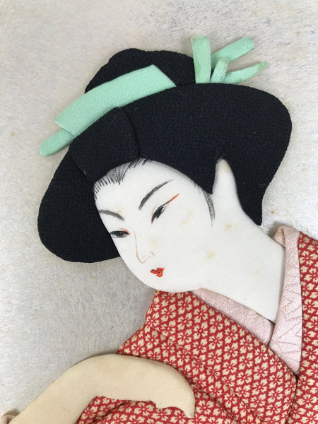 This vintage Japanese shikishi art board features an oshie-zaiku (Japanese patchwork) design of a geisha wearing a beautiful red kimono with a hishi plant pattern. She has a mint-green hair decoration, and she poses beneath a crescent moon over a silver background. Oshie-zaiku gives a unique 3D appearance.