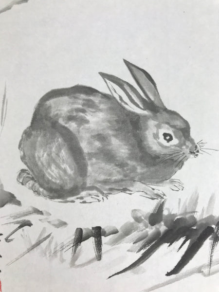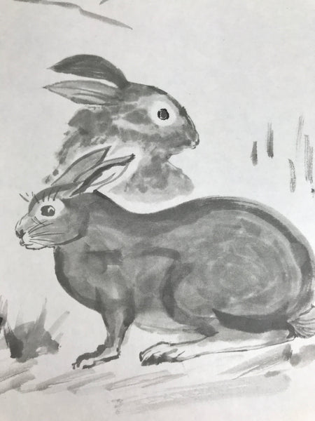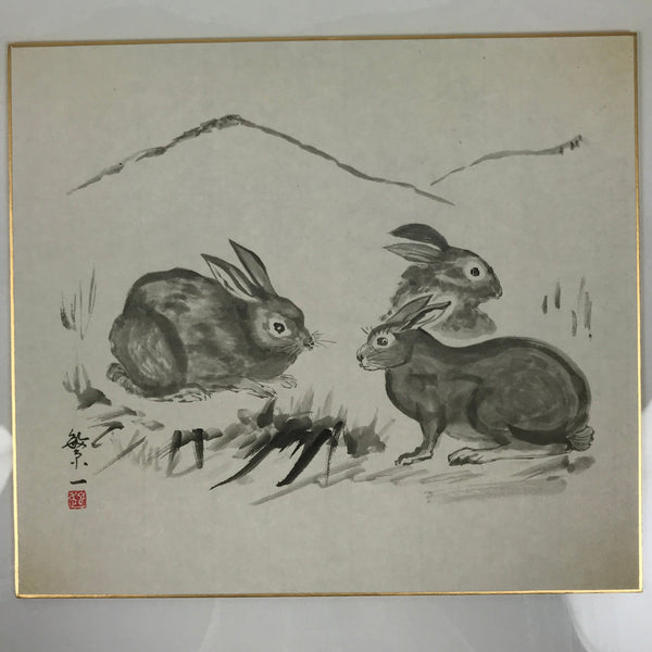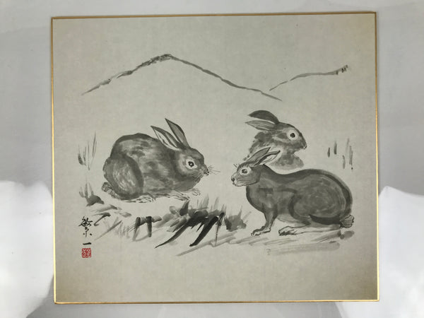 This Japanese shikishi art board is a printed reproduction featuring three rabbits in the wild. Grass is painted in the foreground, and mountains in the background. It is a black-and-white monochrome art board. This shikishi is signed with a name and a red seal, and it is stored in a plastic sleeve. There is a paper with explanations in Japanese on the back.