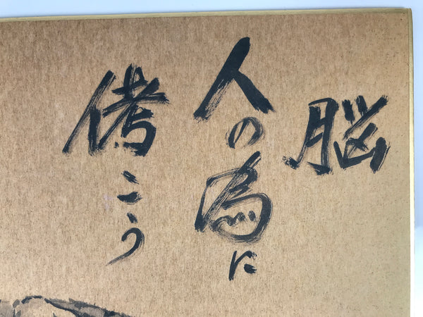 This Japanese shikishi art board is a printed reproduction featuring a tiger roaring and a calligraphy of an idiom. The idiom says 'Head, be useful for people', from an old tradition blessing new born children. This shikishi is black ink on a brown background. It is signed with a name and a red seal, and is stored in a plastic sleeve. There is a paper with explanations in Japanese on the back.
