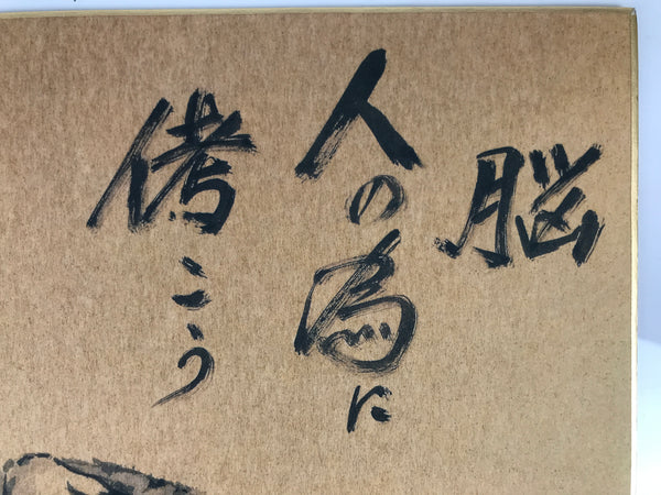 This Japanese shikishi art board is a printed reproduction featuring a tiger roaring and a calligraphy of an idiom. The idiom says 'Head, be useful for people', from an old tradition blessing new born children. This shikishi is black ink on a brown background. It is signed with a name and a red seal, and is stored in a plastic sleeve. There is a paper with explanations in Japanese on the back.