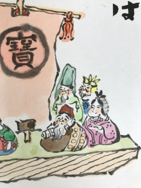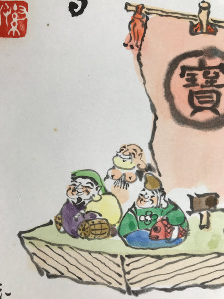 This Japanese shikishi art board is a printed reproduction featuring a picture of Takarabune, the boat of the Seven Lucky Gods. The Seven Lucky Gods are pictured on the boat, in a cute and round style. At the top of the shikishi, there is a calligraphy about prosperity for the shop. This shikishi is signed with a name and a red seal, and it is stored in a plastic sleeve.