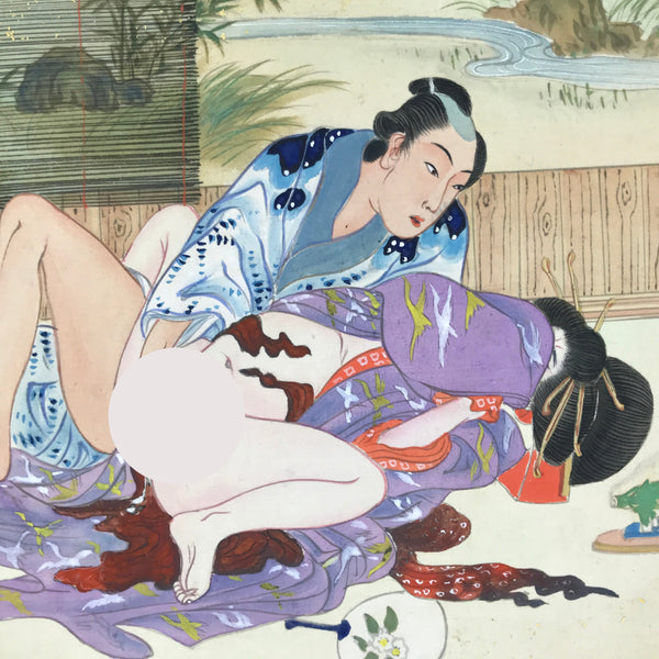 This is a Japanese erotic shunga hand-painted piece. It depicts a man and a woman. A stream can be seen outside a window. There are a folding fan and a stand with a mosquito coil on the floor. The picture is painted on silk, attached to a thick sheet of washi paper.