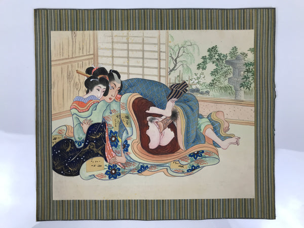 This is a Japanese erotic shunga hand-painted piece. It depicts a man and a woman. A garden can be seen outside a window. The picture is painted on silk, attached to a thick sheet of washi paper.