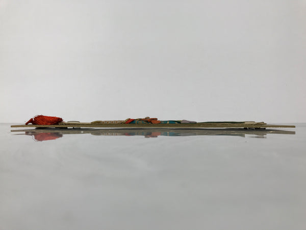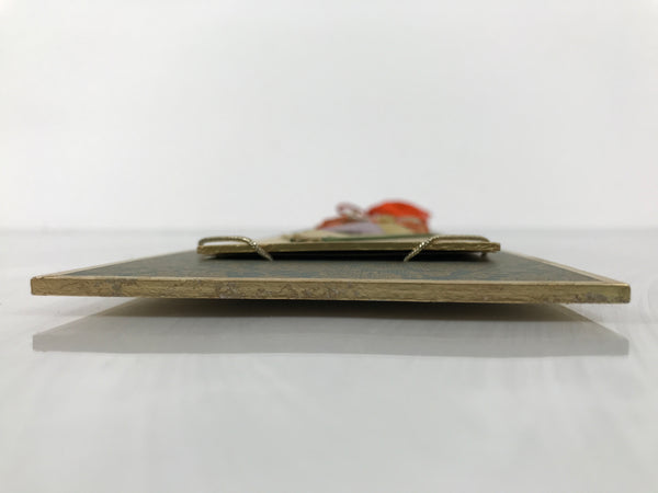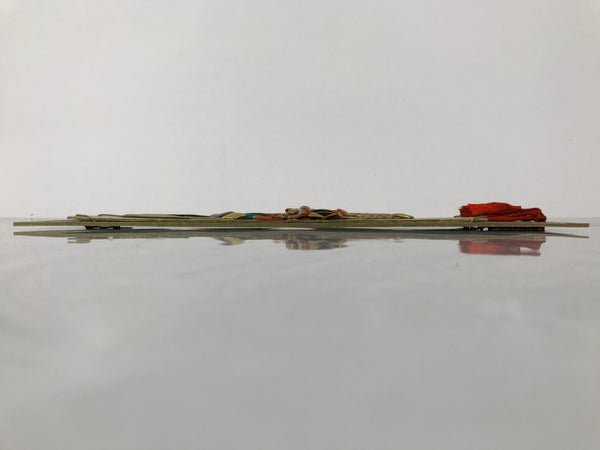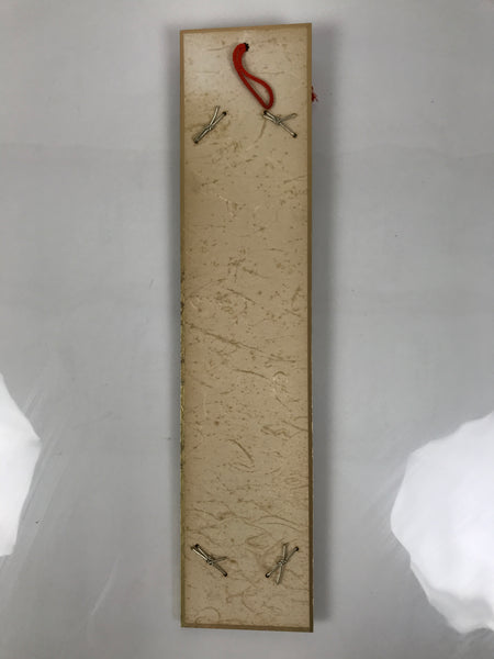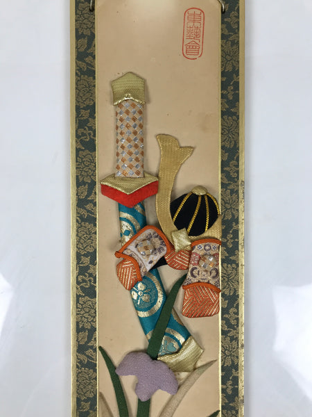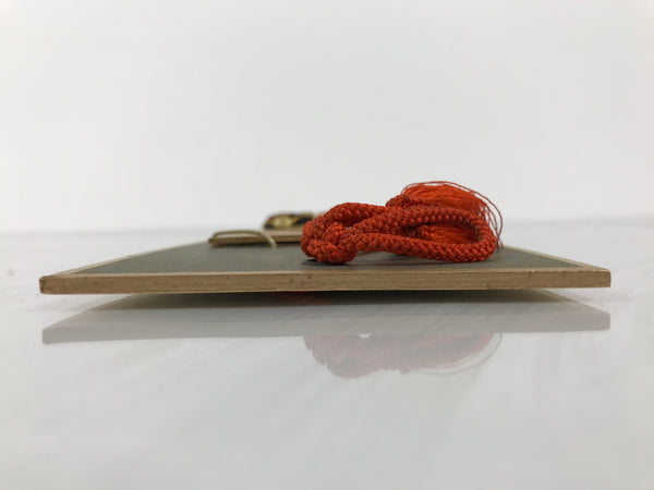 This is a vintage Japanese wall hanging frame, Tanzaku-kake, made of wood or thick paper covered with washi paper on the back with a framed Tanzaku. A Tanzaku is a long and narrow Shikishi used for painting and writing Japanese poems such as Haiku or Tanka. The Tanzaku features a oshie pressed textile design with a kabuto helmet, a Japanese katana sword, and an iris flower (hana shoubu in Japanese). This design is perfect for Kodomo No Hi (Children's Day). There is a orange string with tassels to hang up the Tanzaku-kake. This item comes in a box.