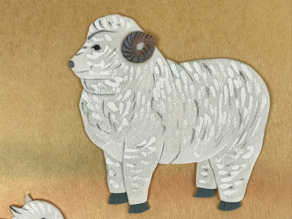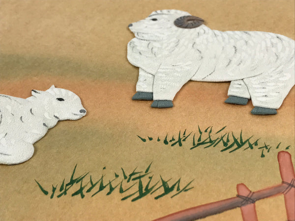 This item is a vintage Japanese shikishi art board. In the style of oshie zaiku, or padded silk, this piece features raised zodiac images of a sheep and a lamb in white with a sunset-colored background and painted fence. This particular piece was handcrafted at the Higashigawa Handicraft Workshop in Omi Hachiman, Shiga Prefecture and comes with its original cardboard cover. It is signed with red seals.