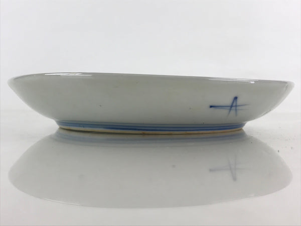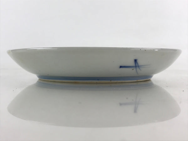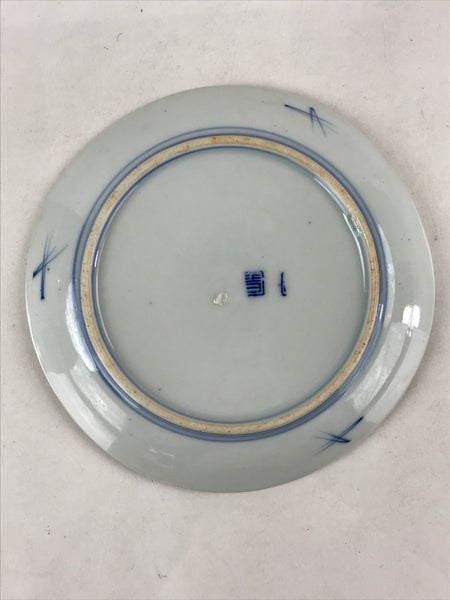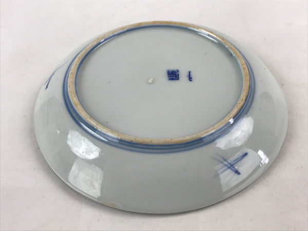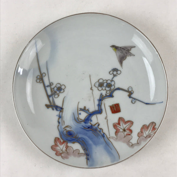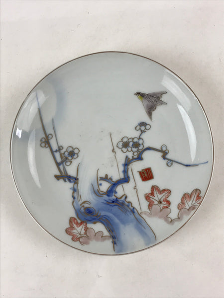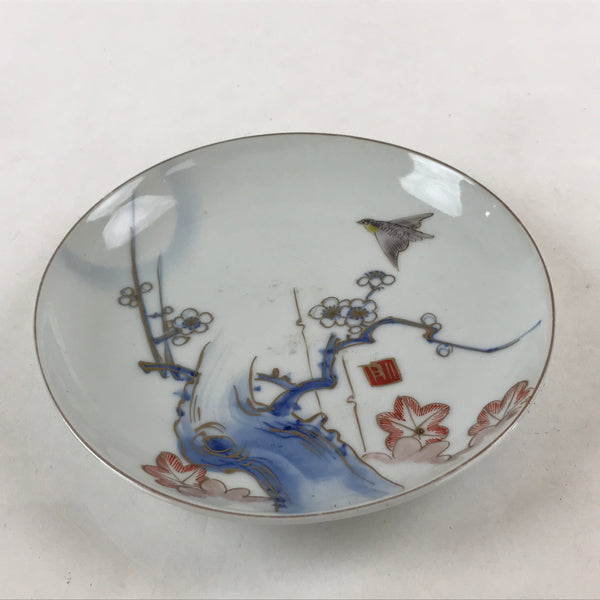This is an antique side plate (small plate) made in Japan. Plum blossoms and a nightingale (Uguisu) are drawn on the plate, and they are traced in gold. This design is called Imari-Ume. Some distortion is seen in the plate. Because it used firewood instead of gas or electricity like today, the temperature was unstable and it was easy to warp. There are little spots and dust marks (goma) you can see on the plate. This is where the ash fell when it was fired in the kiln. There is a piece of white porcelain (Me-Ato mark) on the bottom.