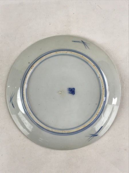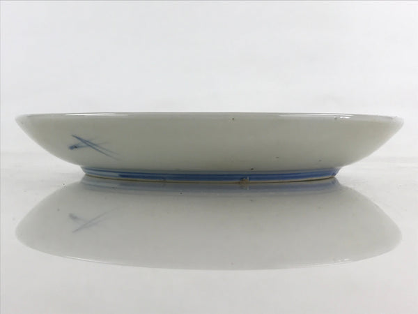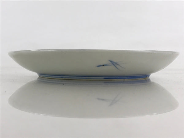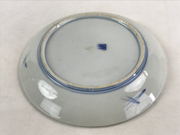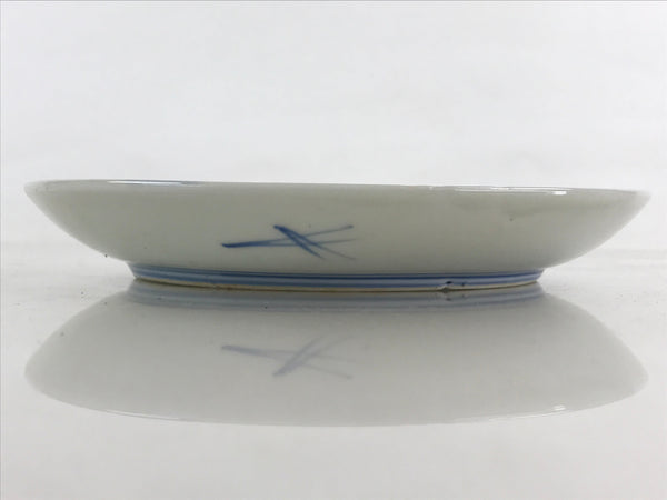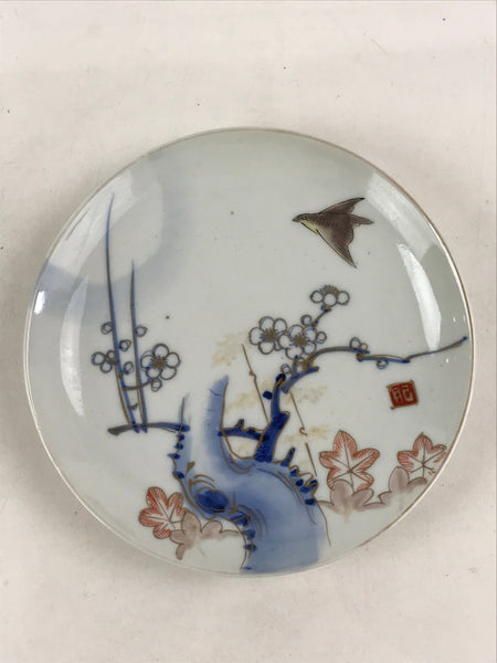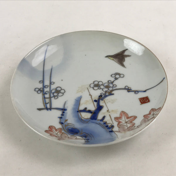 This is an antique side plate (small plate) made in Japan. Plum blossoms and a nightingale (Uguisu) are drawn on the plate, and they are traced in gold. This design is called Imari-Ume. Some distortion is seen in the plate. Because it used firewood instead of gas or electricity like today, the temperature was unstable and it was easy to warp. There are little spots and dust marks (goma) you can see on the plate. This is where the ash fell when it was fired in the kiln. There is a piece of white porcelain (Me-Ato mark) on the bottom.