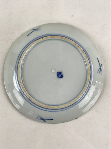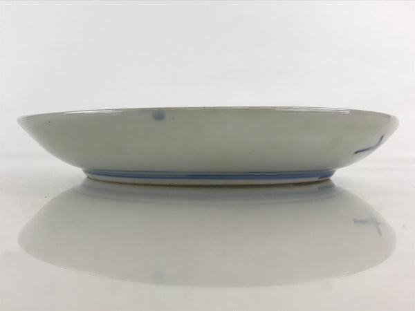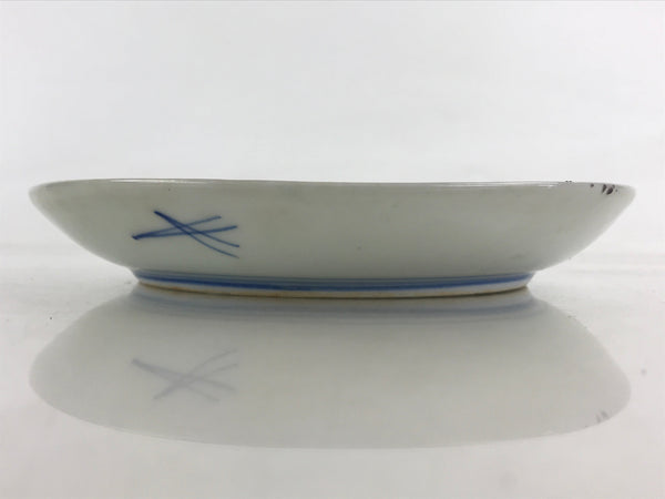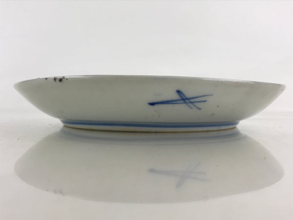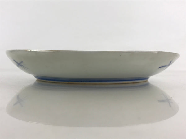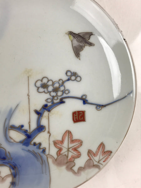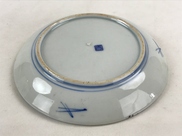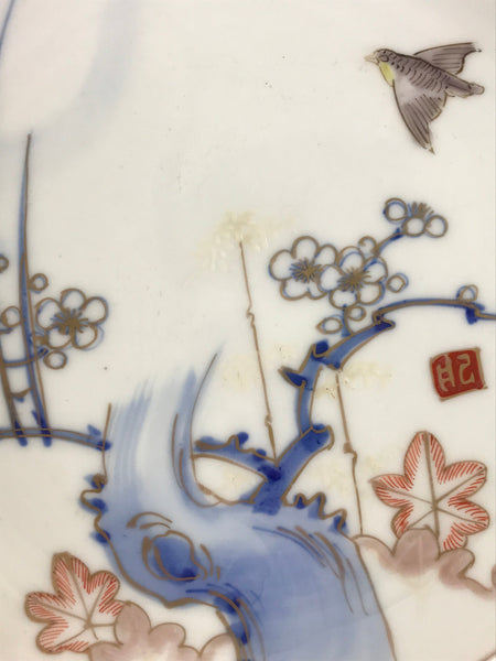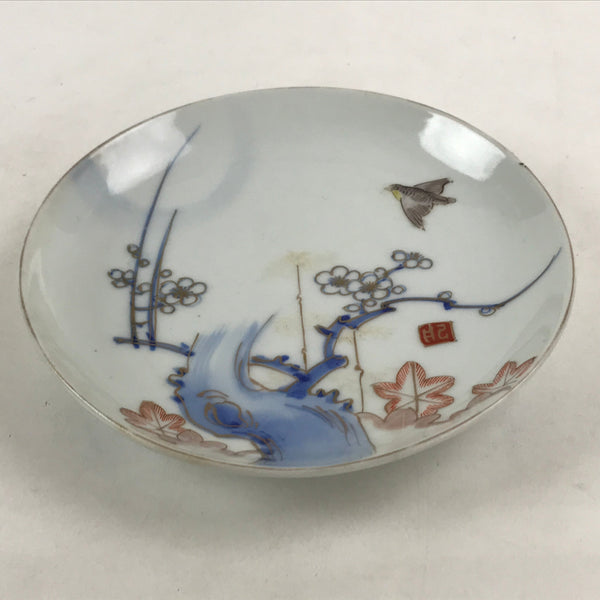 This is an antique side plate (small plate) made in Japan. Plum blossoms and a nightingale (Uguisu) are drawn on the plate, and they are traced in gold. This design is called Imari-Ume. Some distortion is seen in the plate. Because it used firewood instead of gas or electricity like today, the temperature was unstable and it was easy to warp. There are little spots and dust marks (goma) you can see on the plate. This is where the ash fell when it was fired in the kiln. There is a piece of white porcelain (Me-Ato mark) on the bottom.