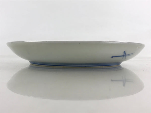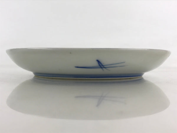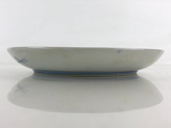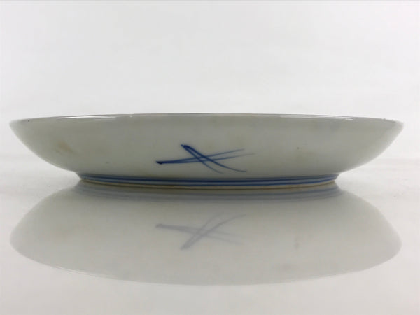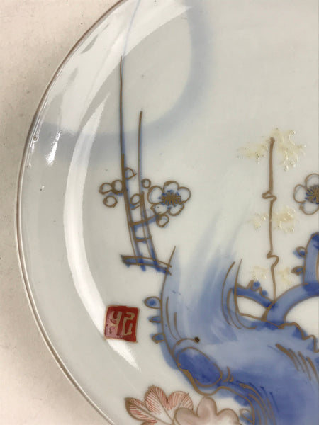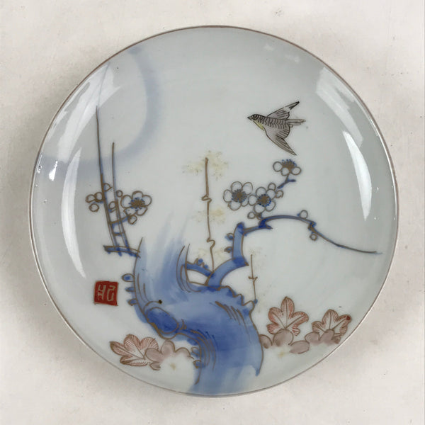 This is an antique side plate (small plate) made in Japan. Plum blossoms and a nightingale (Uguisu) are drawn on the plate, and they are traced in gold. This design is called Imari-Ume. Some distortion is seen in the plate. Because it used firewood instead of gas or electricity like today, the temperature was unstable and it was easy to warp. There are little spots and dust marks (goma) you can see on the plate. This is where the ash fell when it was fired in the kiln. There is a piece of white porcelain (Me-Ato mark) on the bottom.