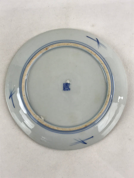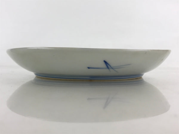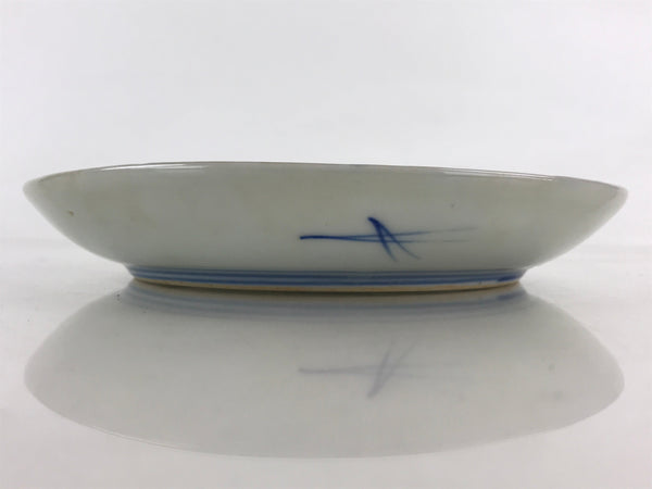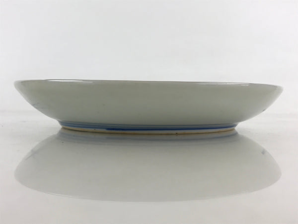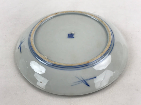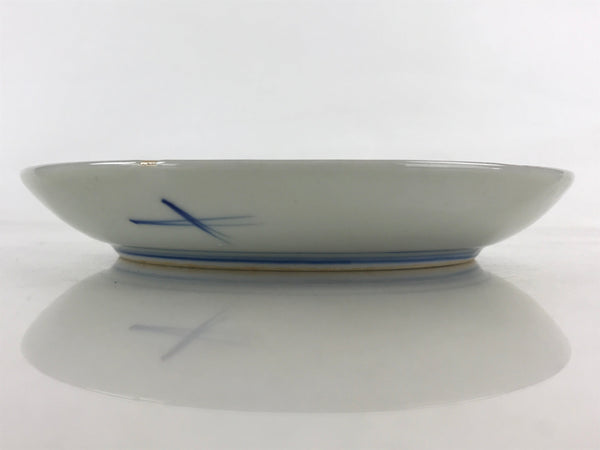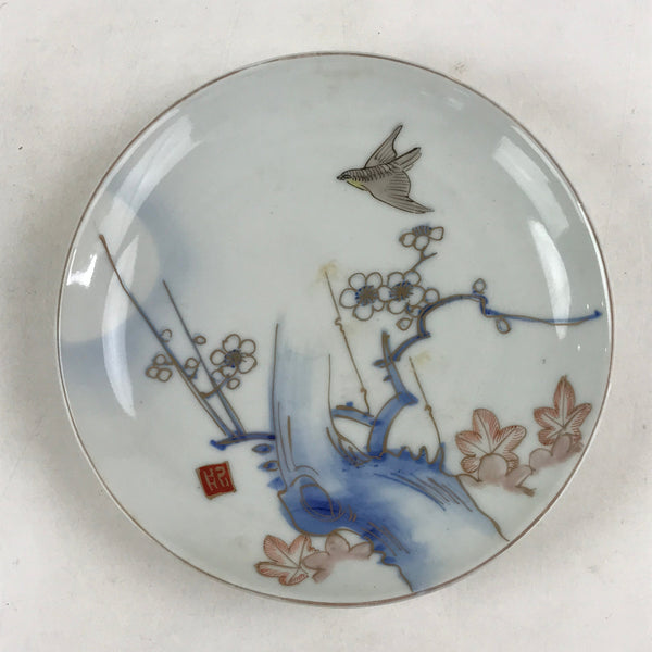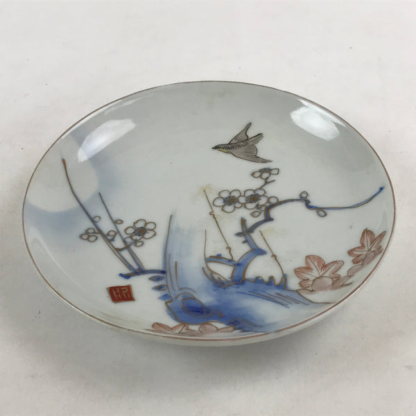 This is an antique side plate (small plate) made in Japan. Plum blossoms and a nightingale (Uguisu) are drawn on the plate, and they are traced in gold. This design is called Imari-Ume. Some distortion is seen in the plate. Because it used firewood instead of gas or electricity like today, the temperature was unstable and it was easy to warp. There are little spots and dust marks (goma) you can see on the plate. This is where the ash fell when it was fired in the kiln. There is a piece of white porcelain (Me-Ato mark) on the bottom.
