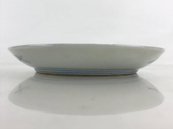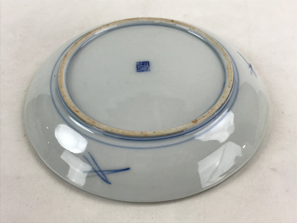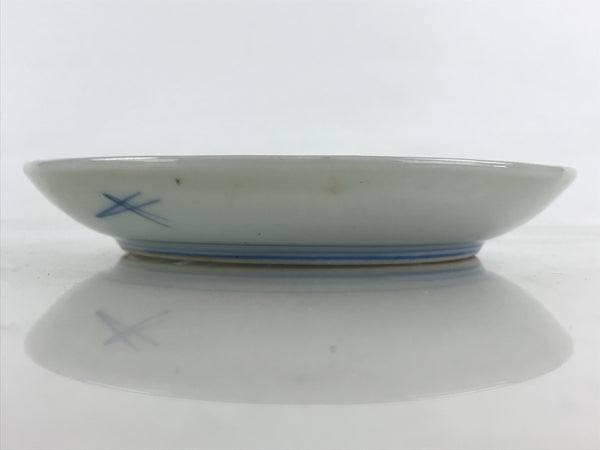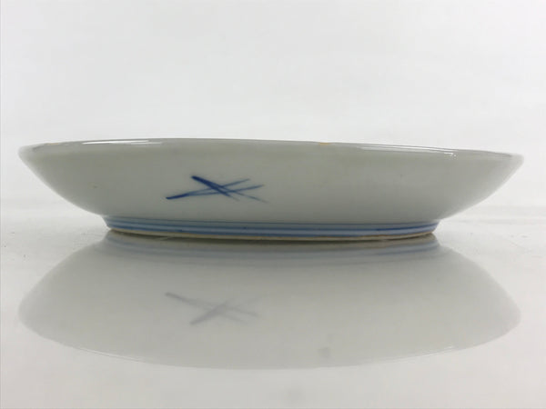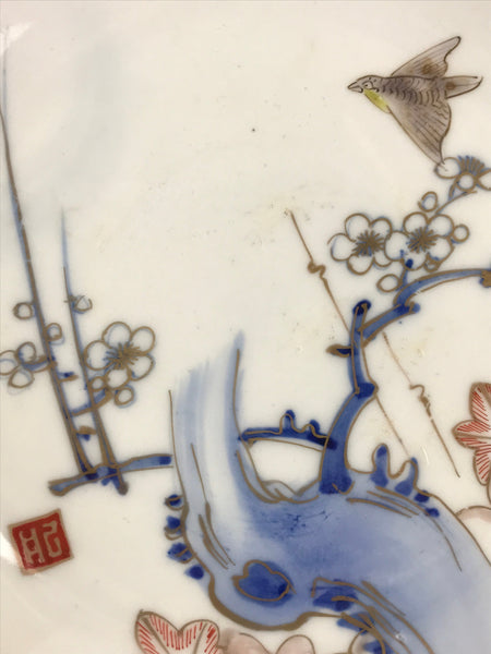 This is an antique side plate (small plate) made in Japan. Plum blossoms and a nightingale (Uguisu) are drawn on the plate, and they are traced in gold. This design is called Imari-Ume. Some distortion is seen in the plate. Because it used firewood instead of gas or electricity like today, the temperature was unstable and it was easy to warp. There are little spots and dust marks (goma) you can see on the plate. This is where the ash fell when it was fired in the kiln. There is a piece of white porcelain (Me-Ato mark) on the bottom.