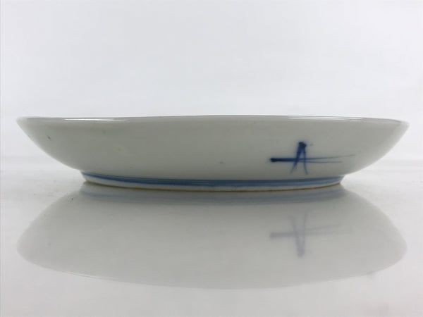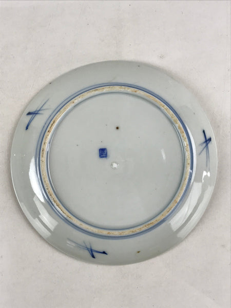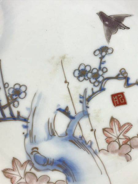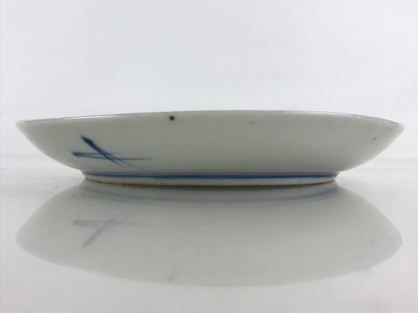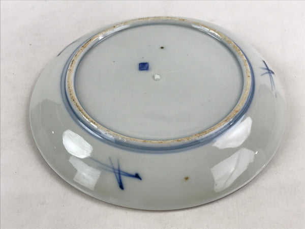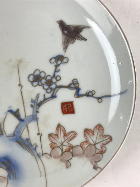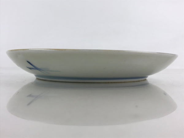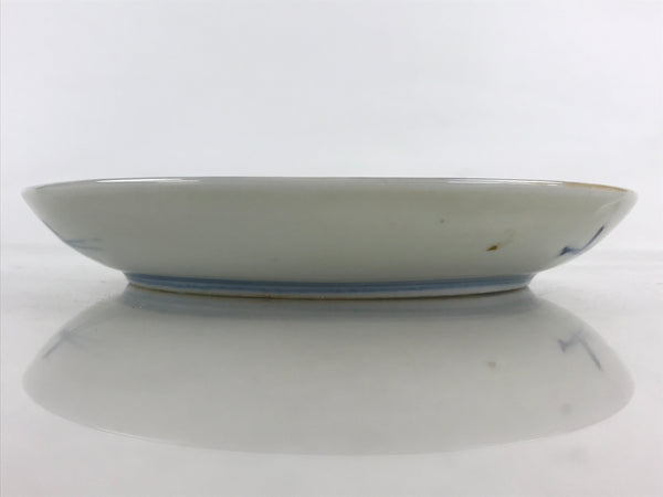 This is an antique side plate (small plate) made in Japan. Plum blossoms and a nightingale (Uguisu) are drawn on the plate, and they are traced in gold. This design is called Imari-Ume. Some distortion is seen in the plate. Because it used firewood instead of gas or electricity like today, the temperature was unstable and it was easy to warp. There are little spots and dust marks (goma) you can see on the plate. This is where the ash fell when it was fired in the kiln. There is a piece of white porcelain (Me-Ato mark) on the bottom.