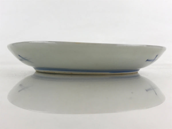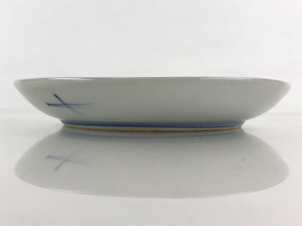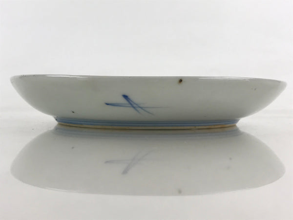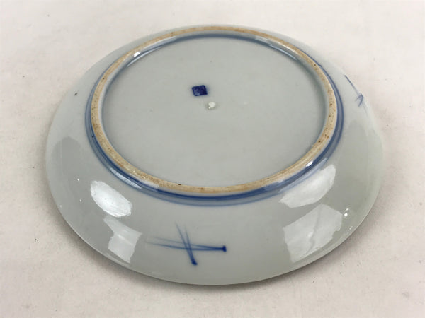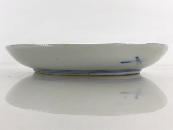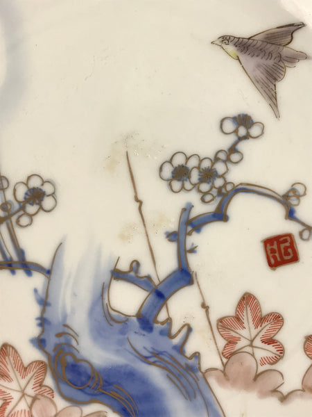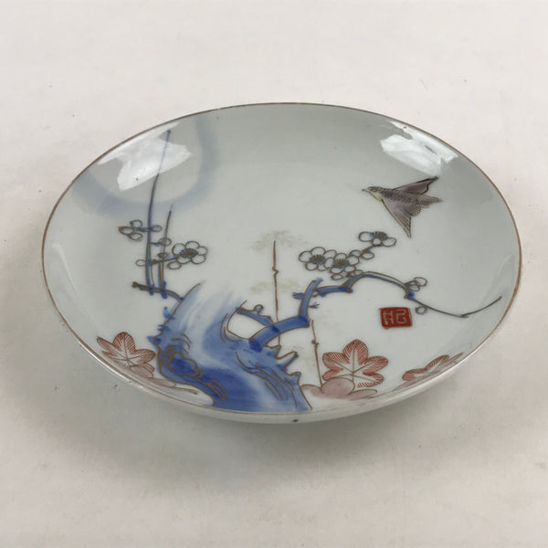 This is an antique side plate (small plate) made in Japan. Plum blossoms and a nightingale (Uguisu) are drawn on the plate, and they are traced in gold. This design is called Imari-Ume. Some distortion is seen in the plate. Because it used firewood instead of gas or electricity like today, the temperature was unstable and it was easy to warp. There are little spots and dust marks (goma) you can see on the plate. This is where the ash fell when it was fired in the kiln. There is a piece of white porcelain (Me-Ato mark) on the bottom.