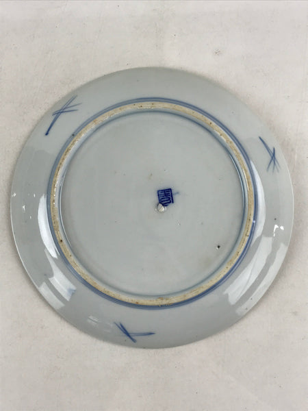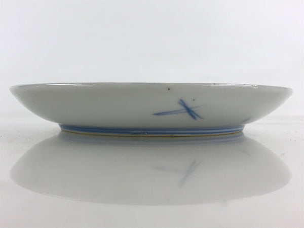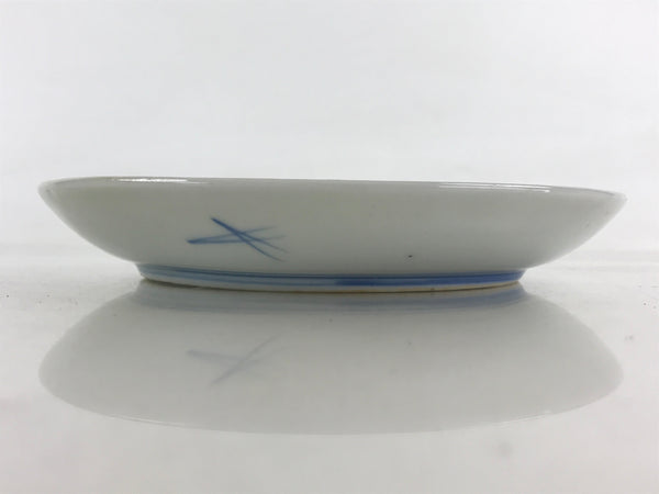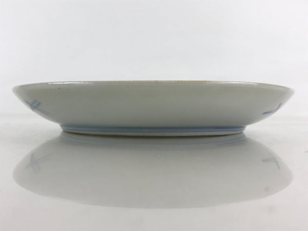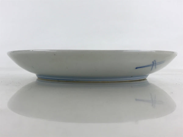 This is an antique side plate (small plate) made in Japan. Plum blossoms and a nightingale (Uguisu) are drawn on the plate, and they are traced in gold. This design is called Imari-Ume. Some distortion is seen in the plate. Because it used firewood instead of gas or electricity like today, the temperature was unstable and it was easy to warp. There are little spots and dust marks (goma) you can see on the plate. This is where the ash fell when it was fired in the kiln. There is a piece of white porcelain (Me-Ato mark) on the bottom.