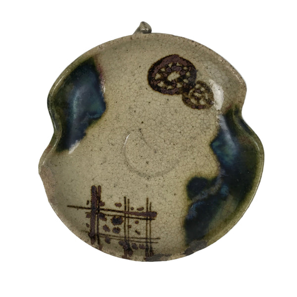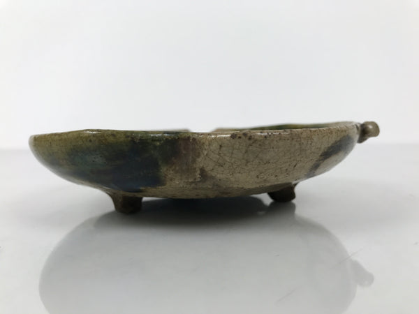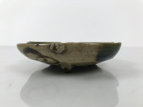 This is a vintage Japanese small ceramic plate. In true Oribe style, it is glazed with a mixture of browns and green drip accents and simple dark brown line designs. It is hyotan/gourd-shaped and stands on three small feet.