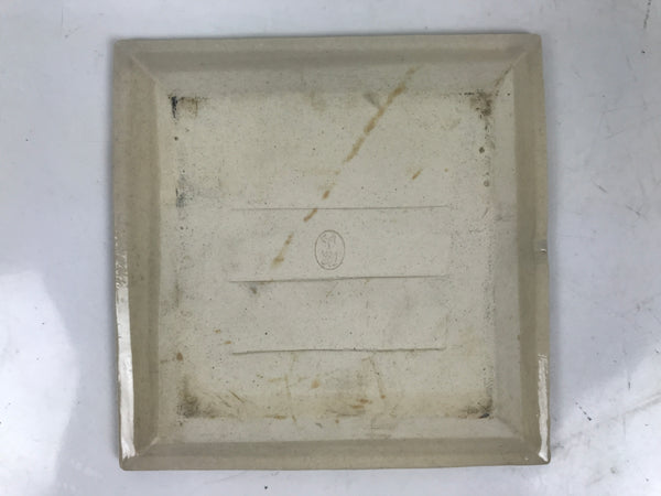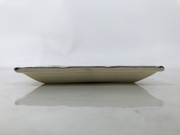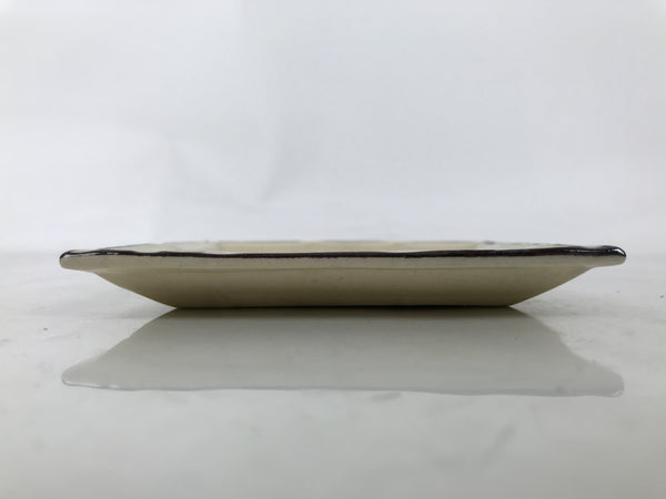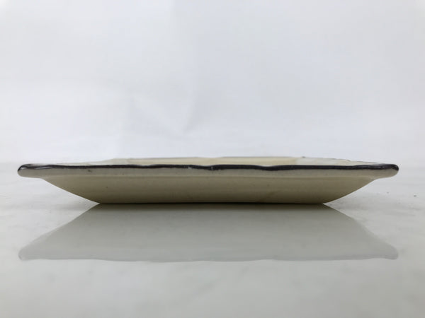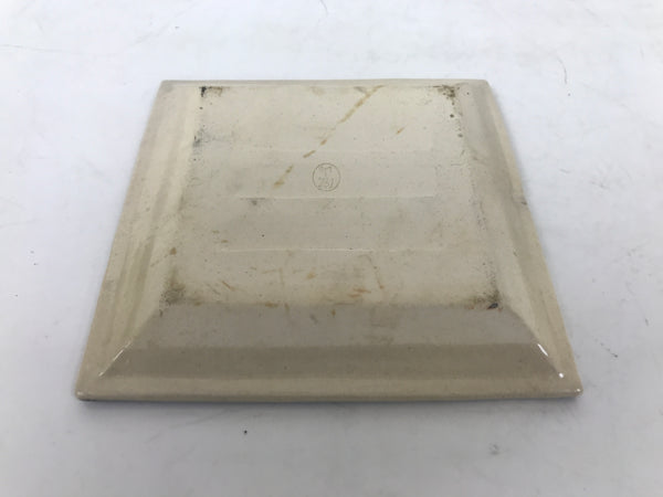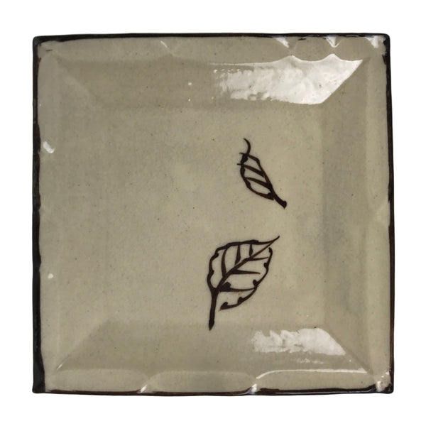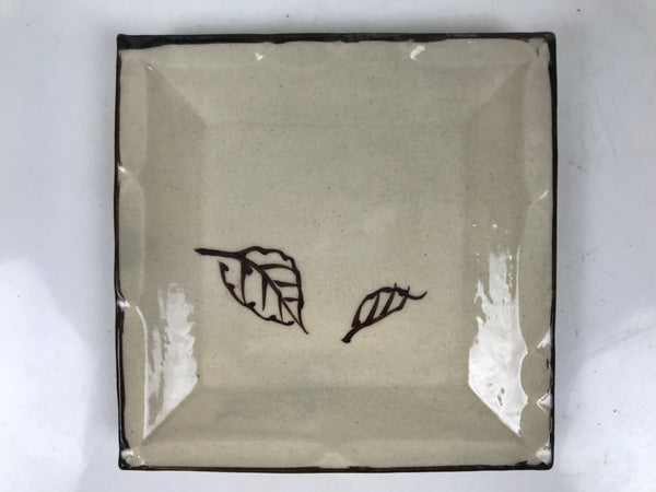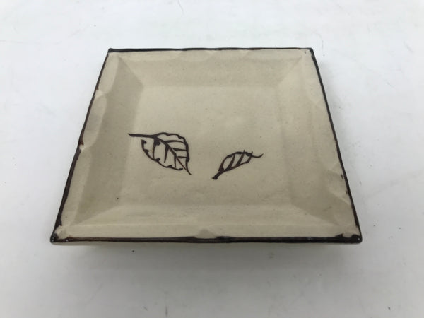 This is a vintage Japanese ceramic pottery plate. This small-sized square plate, also called sara or kozara, has a light beige glaze with a brown border and a painted brown leaf design. It also has a decorative grooved edge. This item is perfect for small side dishes, condiments, dipping sauces, or simply to hold small jewelry or keys.