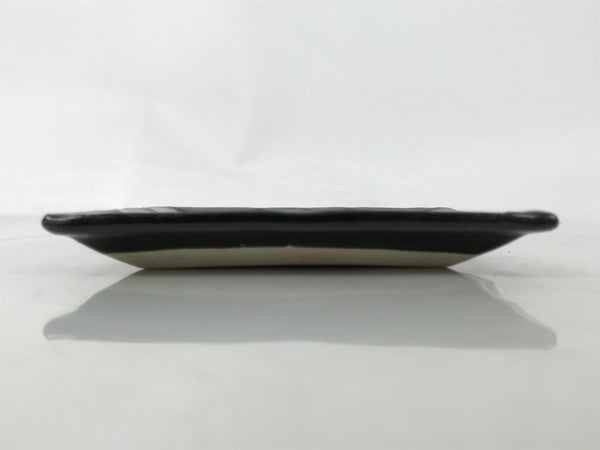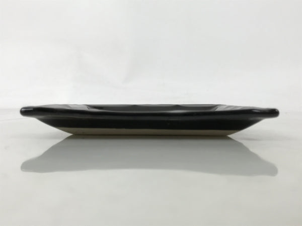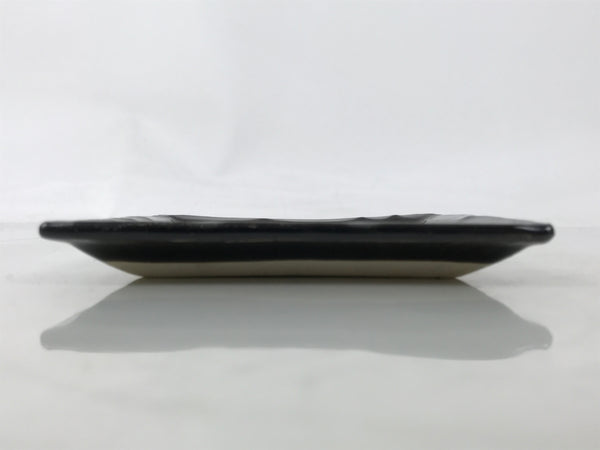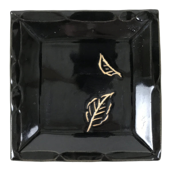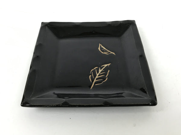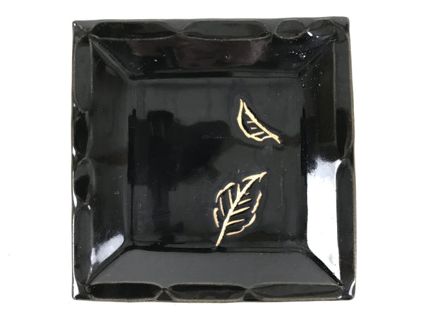 This is a vintage Japanese ceramic pottery plate. This small-sized square plate, also called sara or kozara, is mostly black with an unglazed leaf design and a decorative grooved edge. This item is perfect for small side dishes, condiments, dipping sauces, or simply to hold small jewelry or keys.