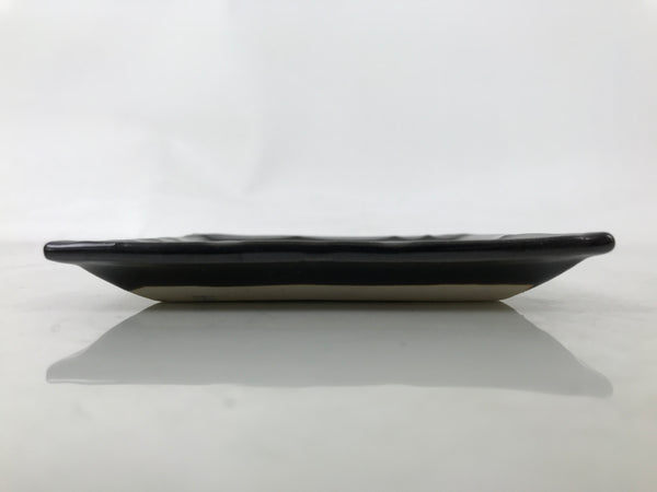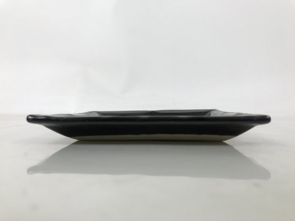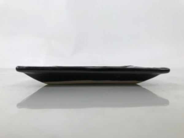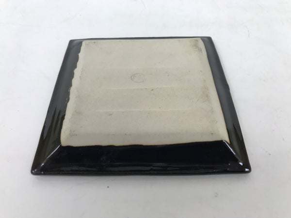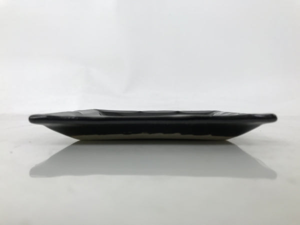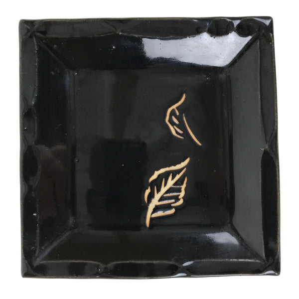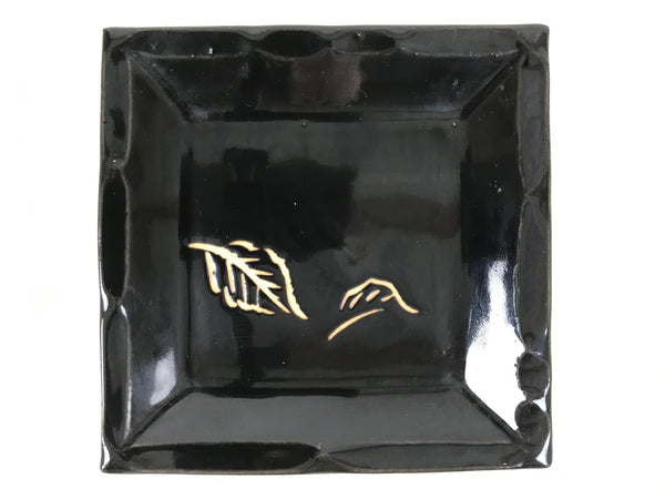 This is a vintage Japanese ceramic pottery plate. This small-sized square plate, also called sara or kozara, is mostly black with an unglazed leaf design and a decorative grooved edge. This item is perfect for small side dishes, condiments, dipping sauces, or simply to hold small jewelry or keys.