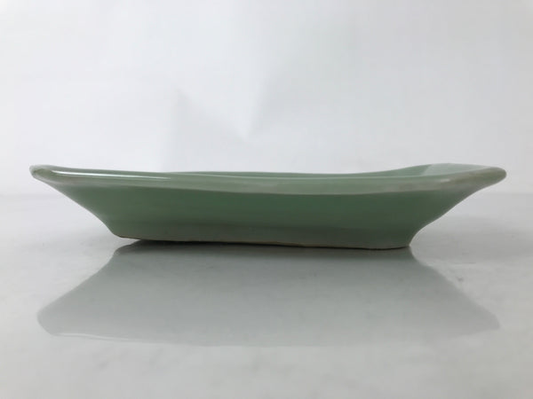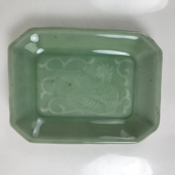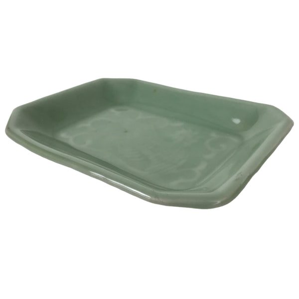 This is an antique Japanese ceramic pottery plate. This rectangular small-sized plate, also called sara or kozara, was made by hand and has a beautiful celadon green glaze with a subtle image of Ho-oh, a legendary bird motif often used in Buddhist art and architecture. The glaze has a smooth texture throughout. This item is perfect for small side dishes, condiments, dipping sauces, or holding small jewelry or keys.